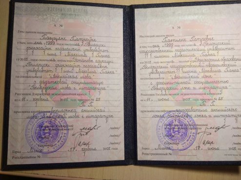 Я имею высшее педагогическое образование. Окончила Белорусский государственный педагогический университет имени М. Танка по специальности: преподаватель английского языка, белорусского языка и литературы